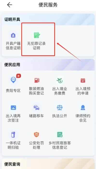 打开APP后,点击界面上的“查看更多”按钮,寻找并选择“无犯罪记录证明”服务。