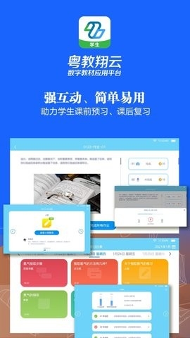 粤教翔云数字教材应用平台(学生端)支持学生使用数字教材,进行自主学习。本平台上的数字教材,全部采用正版授权教材版本,整合了丰富的图片、视频、音频、交互等资源,具有权威、易用、交互性强等特点,本平台免费为广东省义务教育阶段一到九年级的学生,提供数字教材自主学习服务。