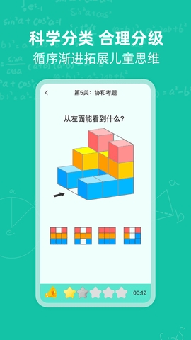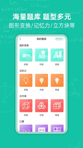 3、提供多元化的内容学习,包括图形变换、加减法、空间想象力、记忆力、立方块、九空格等