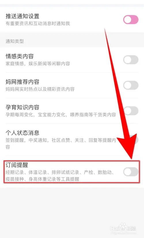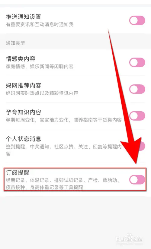 4.《订阅提醒》后面的圆点变为红色即表示打开妈妈网轻聊订阅提醒成功。