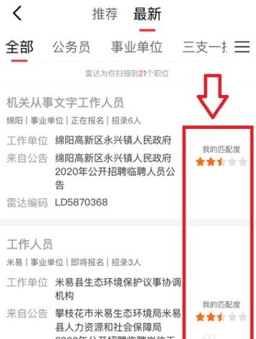解答:在“搜索”页面直接查看适合用户的职位报考公告列表,点击列表进入当前公告的“职位列表”页面。职位会根据用户“个人简历”进行匹配,匹配度以星级评分展示,星级越高表示职位越适合。