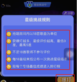 抢唱房间以18首歌曲为单位,每位选手通过抢麦的方式抢唱,其他选手给予爆灯和灭灯选项。18首歌曲之后获得爆灯最多的选手便会在星际挑战中胜出。