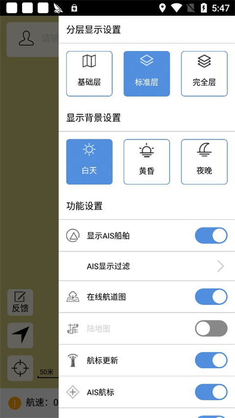打开长江航道图APP后,先进入“设置”并选择“标准层”。此时,你将能清晰地看到长江干线上的各种航道信息: