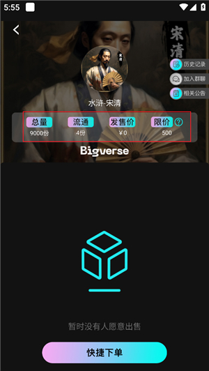 2.查看总量:点击具体的藏品,进入详情页面,你可以查看到该藏品的总量(即铸造总量)和流通量(包括一级市场和二级市场的流通总量)。