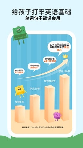 - 只有10分钟: 我们每天只会开启一节新的时长10分钟的英语游戏课程,避免孩子长时间在屏幕前。