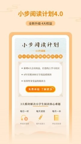 每日一听、每天读测、每月一本,三大模块,每天45分钟,小学六年完成1000万字高品质阅读。