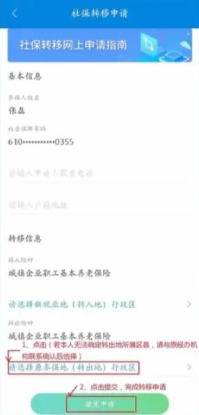 同样地,选择转出地并确认无误后,点击提交申请按钮,完成社保转移申请。