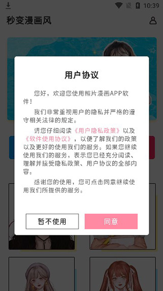 打开app后,首次使用时需要阅读并同意用户协议。