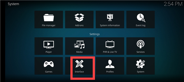 1、新安装好的 Kodi 启动后是英文版的界面,Kodi包含多国语言,我们可以设置改成简体中文界面,点击设置设置齿轮键;