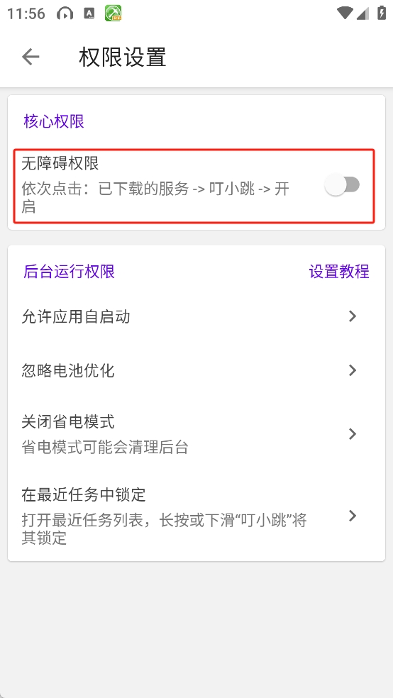 4.开启无障碍权限:在权限设置页面中,用户需要找到并点击“无障碍权限”,然后在列表中找到叮小跳App并开启其权限。