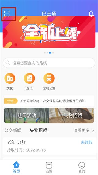 当您需要支付公交费用时,点击屏幕左上角的扫码按钮。