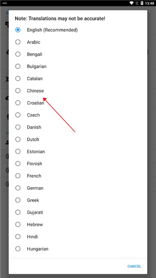3.选择中文:在出现的语言列表中,选中“中文”,随后应用界面将自动转换为中文显示。