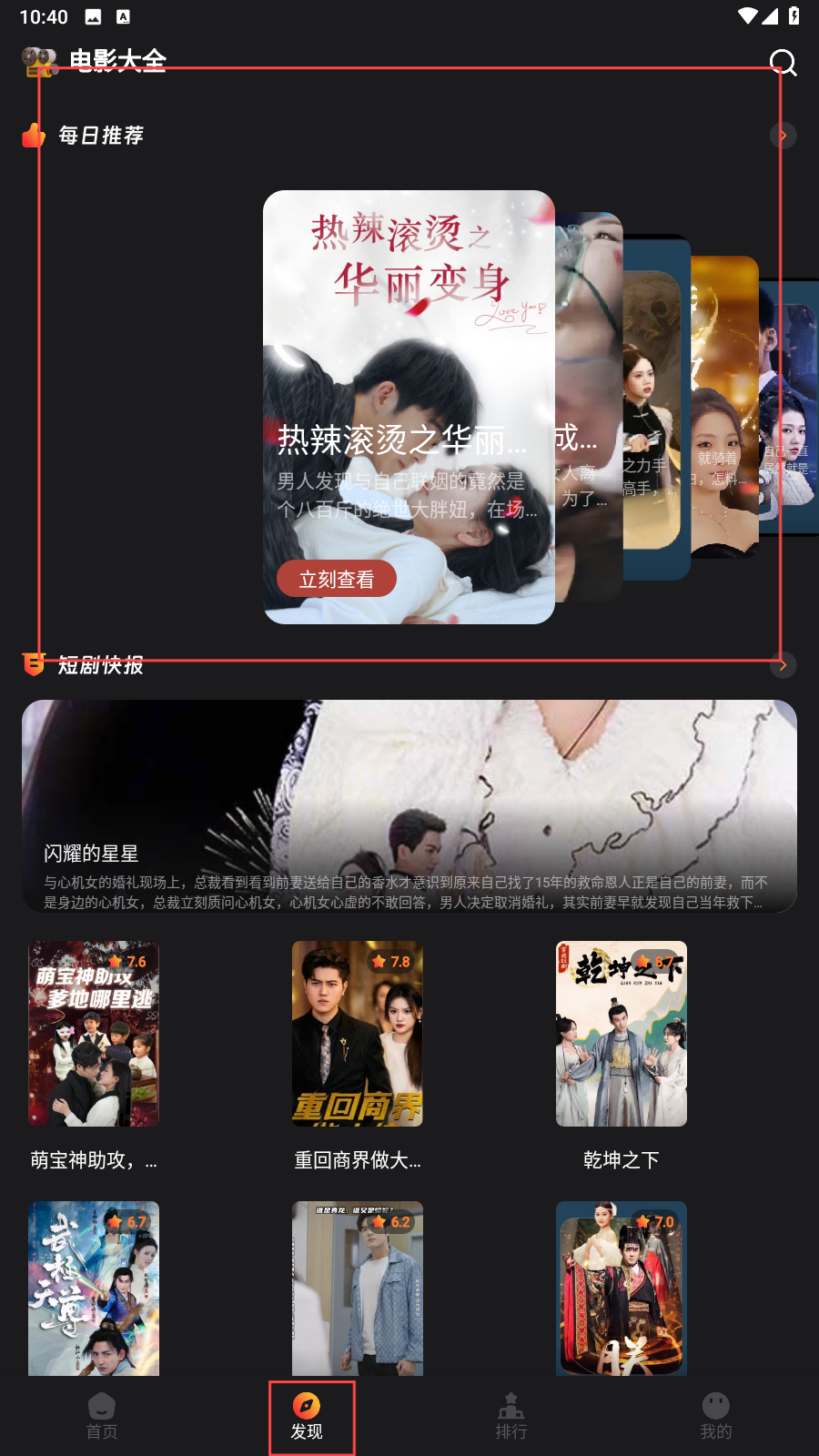 2、如果不知道看什么可以点击【发现】里面会有每日推荐短剧。