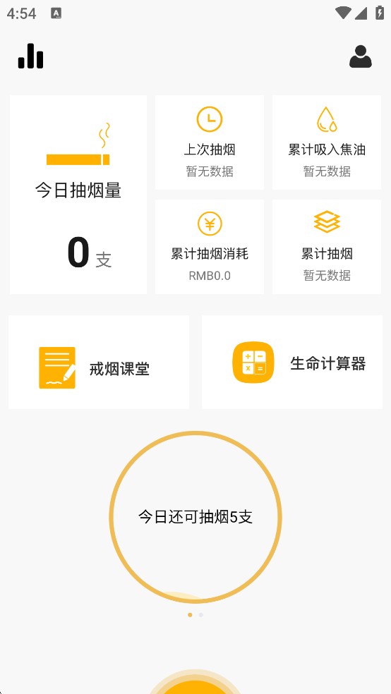填写完基础信息后,你会进入App的主界面。在这里,你可以清晰地看到今日的抽烟量、累计吸入的焦油量等关键数据。这些数据会实时更新,让你随时了解自己的抽烟状况。