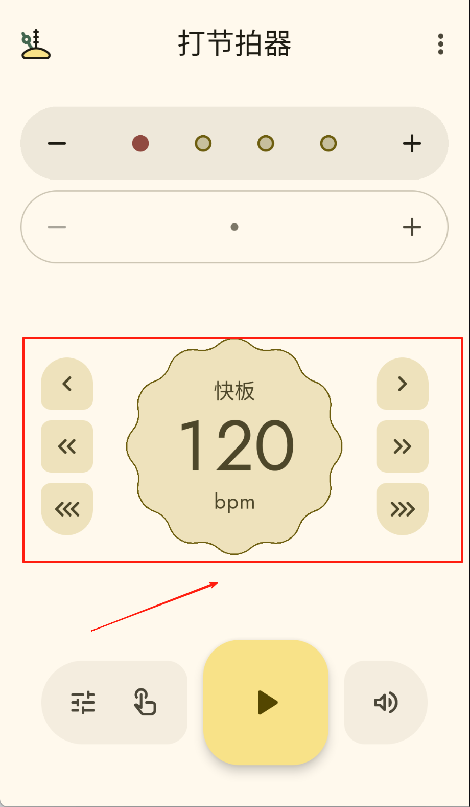 1、主界面旋转拨盘设定目标BPM值,点击音色按钮切换军鼓木鱼等音效,LED指示灯实时闪烁提示节拍点。