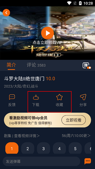 4、点击想要观看的动漫就会来到播放页面中,还可以将动漫下载到本地设备中,方便离线观看,也可以收藏该动漫,随时观看。