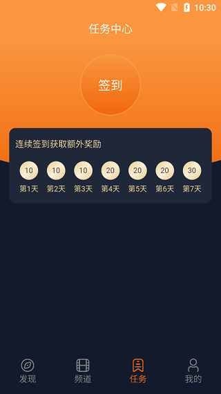 5、进入到“任务”界面中,点击上方中的“签到”按钮,即可完成今日份签到,连续签到就可以获得额外的奖励。