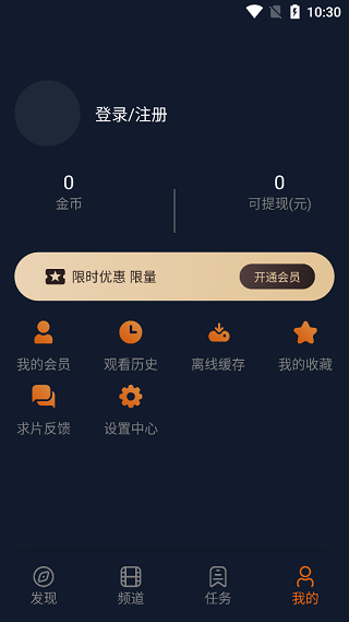 6、切换到“我的”板块中,提供一些常用的功能,比如在这里可以查看到我们的观看历史、收藏夹、反馈等等。
