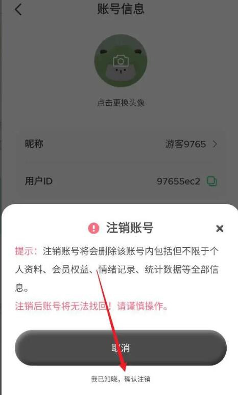 底部会弹出一个确认弹窗,提示“我已知晓,确认注销”。