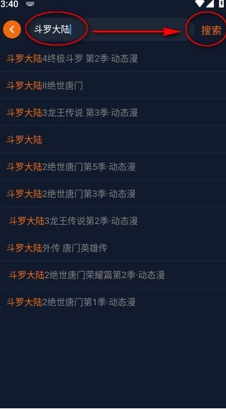 2、输入要看的动漫名称,比如斗罗大陆,下拉会出现智能管理推荐,然后点击“搜索”;