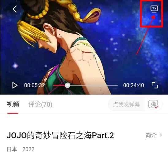 2.点击播放画面后即可找到右上角的投屏按钮。