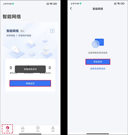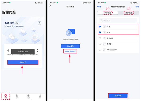 3.选择未组网成员:若已有成员但未加入网络,从“未组网成员”列表中选择并确认添加。