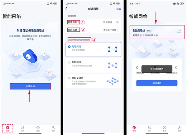 网络类型:选择对等网络(所有成员互联)、集散网络(中心成员与普通成员区分)或自定义网络(自定义访问权限)。