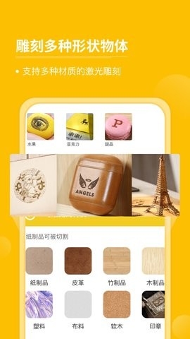 2、通过手机app控制镭雕设备,雕刻到木材,塑料,皮质,纸张,织物,毛毡纸等材质上 。