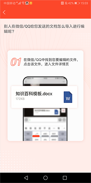 如果你想编辑从微信、QQ等应用中接收到的文档,只需简单几步操作,就能将文档导入到Office文档编辑app中进行处理。