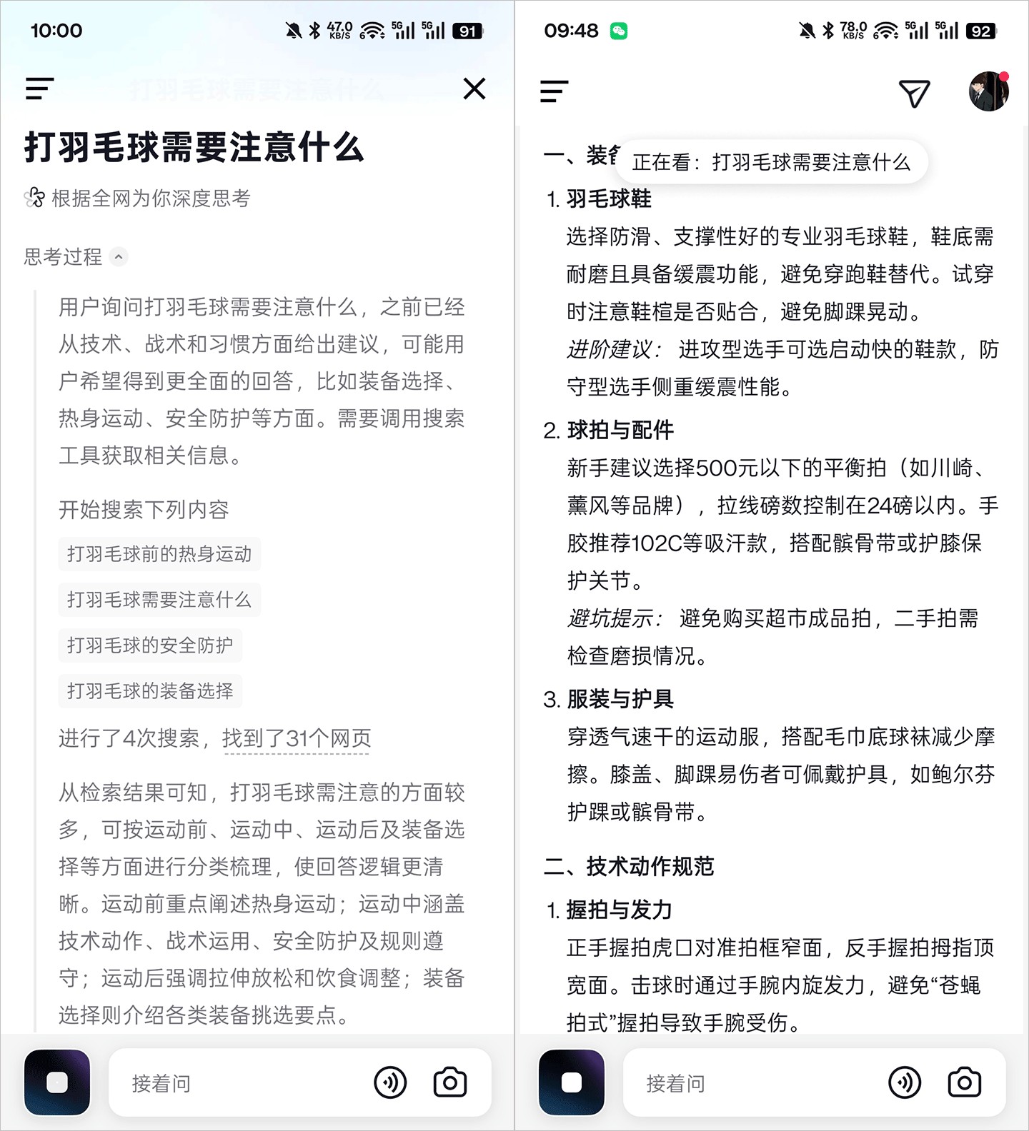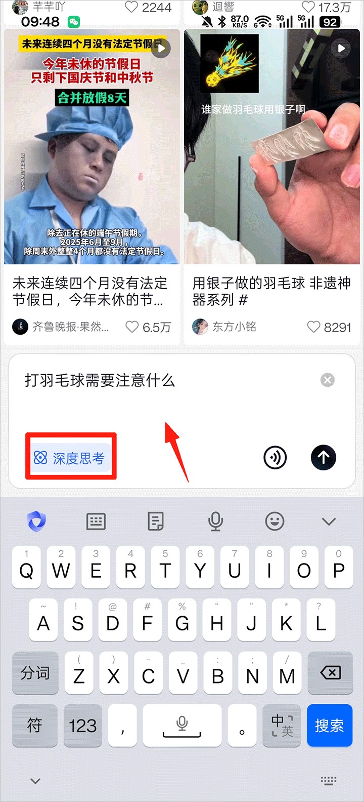 2.深度思考模式:为了获得更可靠、更精准的搜索结果,你可以启用“深度思考”模式。