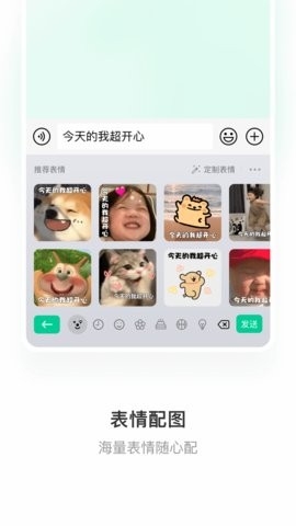 拥有智能拼写、智能推荐、表情推荐等功能,在聊天交流中,可以更便捷的分享你想表达的内容或表情。