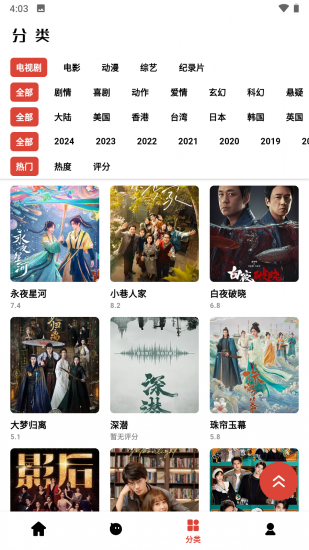 1、一键点击进行筛选,可以根据电影、电视剧以及类型等多种分类去筛选想看的内容。