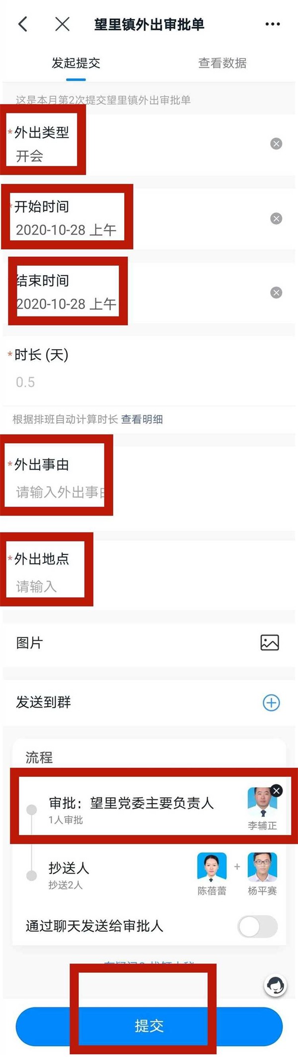 4.提交审批:填写完信息后,选择镇党委书记作为审批人,并提交审批。审批通过后,系统会自动更新你的考勤情况。