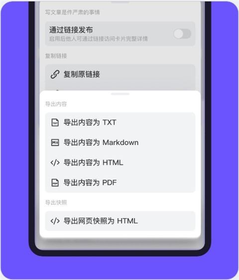 支持将内容导出为 Markdown、HTML、PDF 等格式的文本或文件,方便用户在不同平台间迁移和使用。