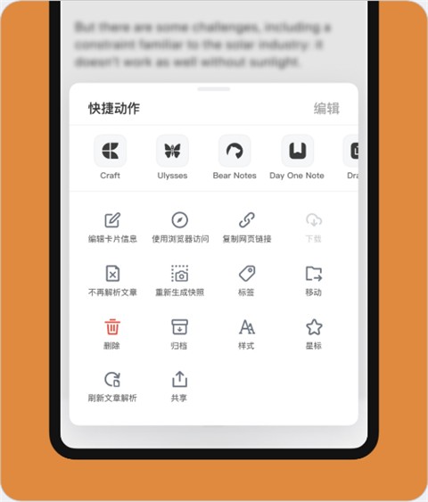 -通过自定义动作功能,你可以借助URL Schemes创建快捷动作,将自定义的数据输出到其他应用中,如笔记、待办等。
