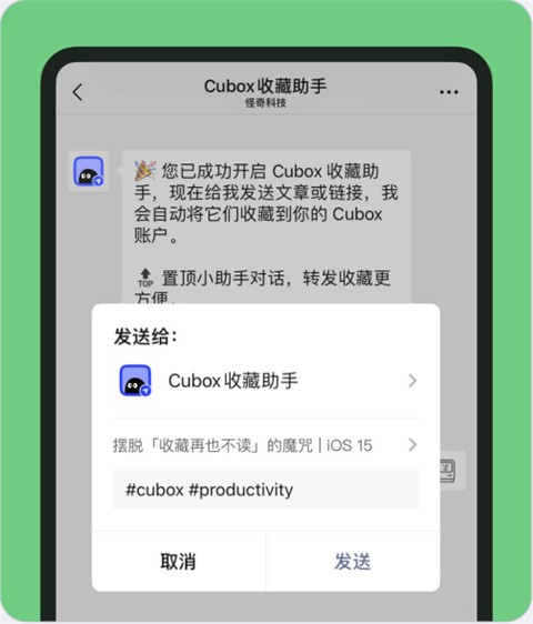 -微信转发:添加微信助手后,你可以直接转发微信消息到Cubox进行收藏。
