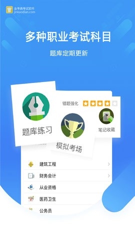 金考典是一款对于职业的考试刷题的软件。在软件上面具有非常多的章节的习题,而且软件上面还具有非常多的学习的资源,可以根据用户们的需求进行制定相应的学习计划,十分的方便,满足用户们的各种的学习的需求,在软件上面还具有多种习题的解析,能够提升学习的效率。