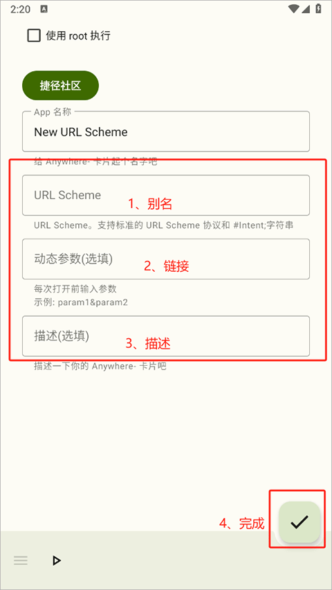 用户可以通过输入URL Scheme来创建快捷方式,实现更灵活的功能定制。