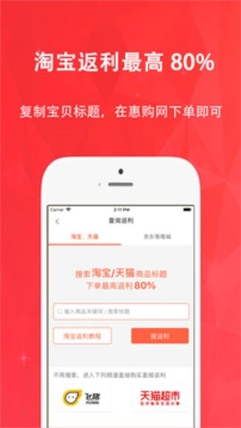 购物返利省钱神器,支持淘宝返利,天猫返利,聚划算返利及超火的九块九包邮返利,商城返利,返利高达50%,在所有返利网站中返比例属于比较高的!支持签到奖励!提现申请24小时到账,注册使用完全免费!在这个网购时代,大家都学会在网上购物优惠的商品,但是购物返利的平台很少,惠购网属于一个安全,快捷的返利机构,有需要的朋友可以来下载体验使用。