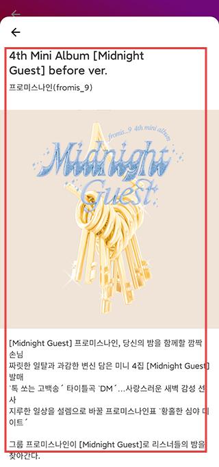 3、点击fromis_9的【4thMiniAlbum[MidnightGuest]beforever】,进入详情页,可查看专辑封面、介绍等信息。