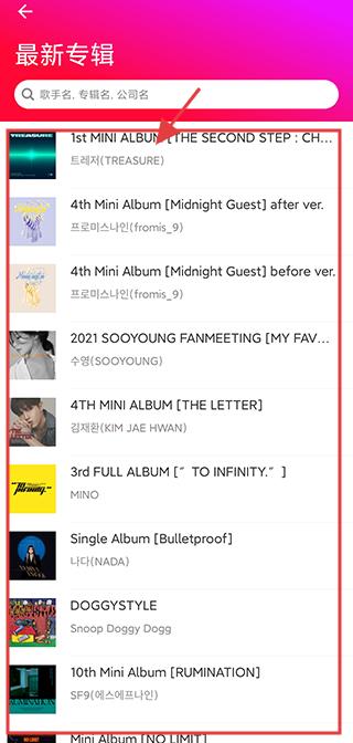 2、进入APP【最新专辑】页,有TREASURE《1stMINIALBUM》、fromis_9《4thMiniAlbum[MidnightGuest]afterver》等专辑列表。