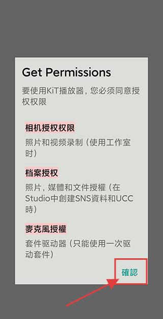 1、在权限申请弹窗,点击【確認】,同意KIT播放器的相机、档案、麦克风等权限。