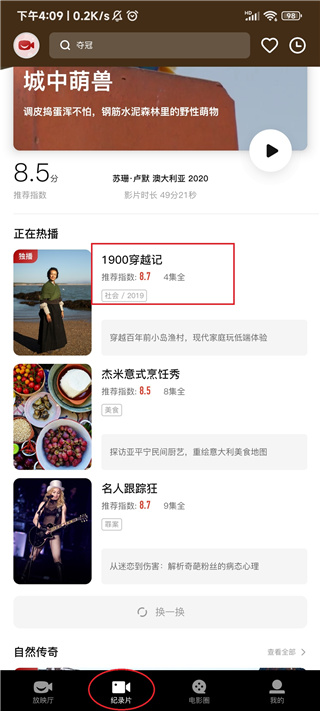 5、选择首页底部的“纪录片”,我们再任意选择一个纪录片,以《1900穿越记》为例;