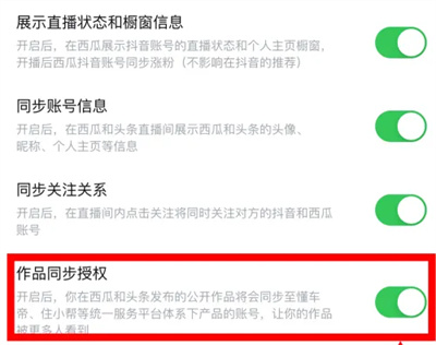 3、接下来,在进入的页面里“数据同步管理”下方有一个“作品同步授权”。在它的后面点击对应的开关按钮,把按钮设置为彩色时代表开启,发布的作品将被统一服务平台体系下的更多人看到。