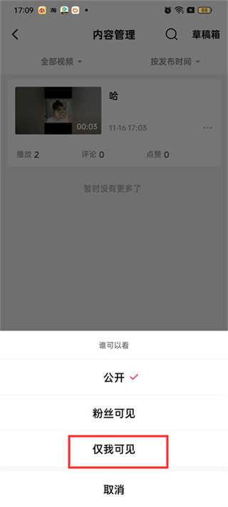 5、最后点击谁可以看到之后会有三个选项公开、粉丝可见和仅我可见,最后只需要点击【仅我可见】即可;