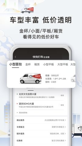 快狗打车企业版app可提供小面、金杯、厢货、皮卡、依维柯、平板、冷藏、高栏、半挂等多种车型,更有数十万名优质司机等您选择。
