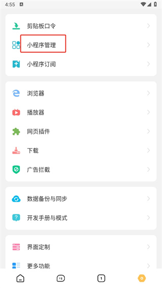 2、然后来到设置的页面中可以看到有剪贴板口令、小程序管理、小程序订阅等服务,我们点击【小程序管理】;
