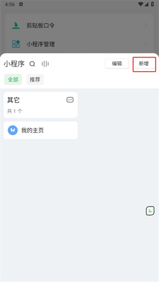 3、接着在小程序对话框中可以看到添加的小程序,我们需要点击的是右上角的【新增】;