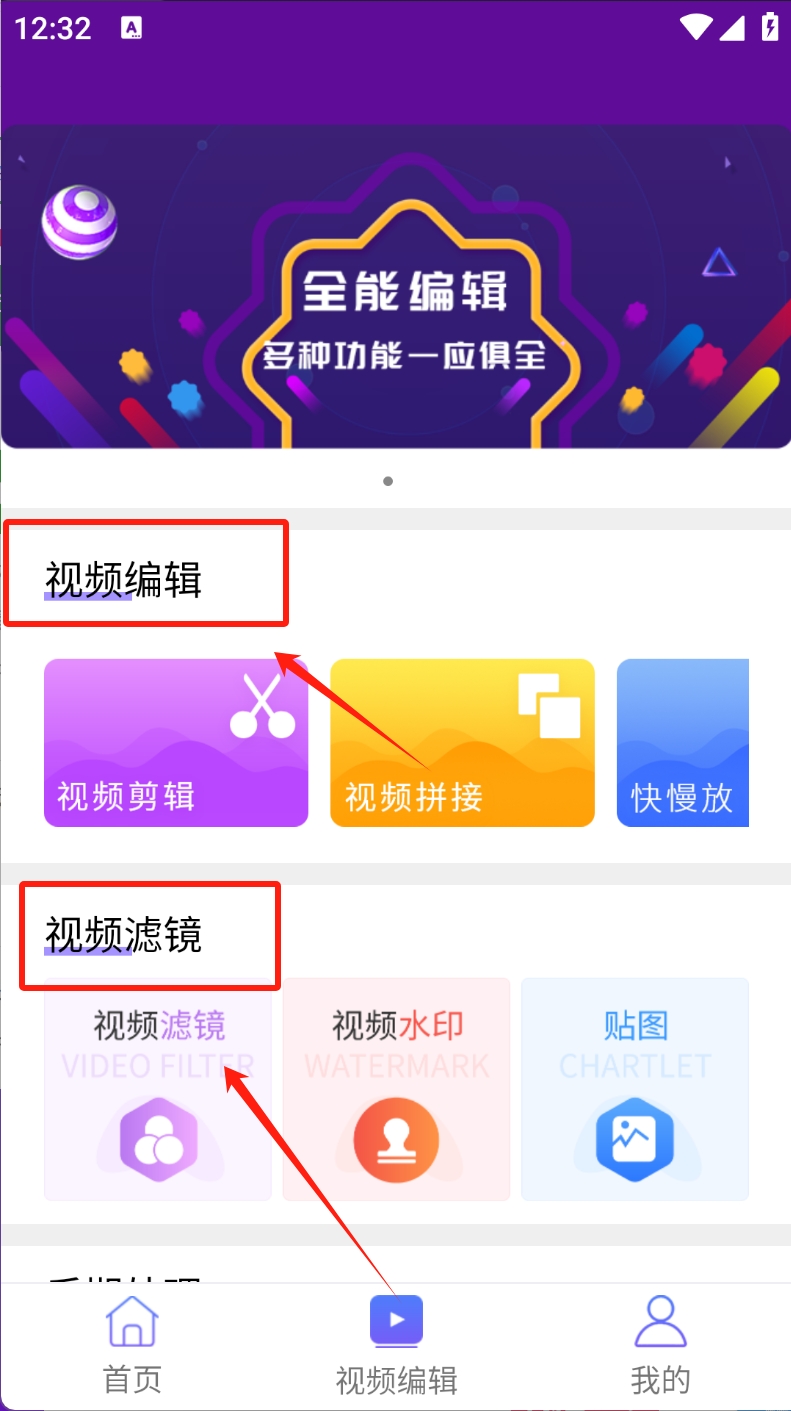2、选择编辑功能:点击“视频剪辑”或“视频滤镜”等选项,选择编辑功能。