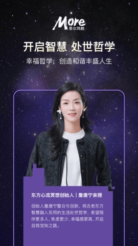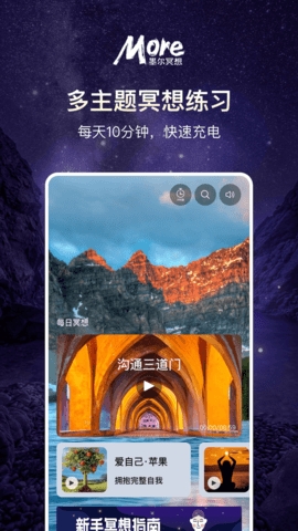 创始人詹唐宁老师,花了6年时间,上山访遍名师,拜师多位冥想功底超过50年的老师。她将当代东西方各大冥想的实用方法进行了整合与创新,4年磨一剑,More冥想聚合了老师多年的实修功底和精品打磨。Less is more,大道至简。每个看似简单的冥想练习,背后却有着深厚而珍贵的传承,支持着你的蜕变提升。和你一起探索more,成长more。